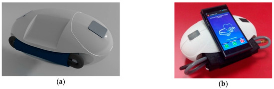 The VM1 external oval-shaped case houses all electronics and hardware modules of the system and includes a smartphone holder. The VM1 is an ergonomic and versatile device that can be used by almost any user. It only requires an external smartphone that runs the VitalMob app, which has been carefully designed to provide a very user-friendly and simple interface. The case has been designed using a set of standard CAD design software tools (such as Rhinoceros® or 3D Studio Max®) and has been made using precise state-of-the-art 3D printers (Figure 4).
