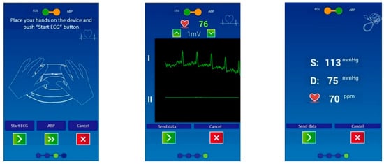 The app includes different functionalities, most of them are transparent to the user to facilitate its use. The process starts with a common login prompt, and continues with a guided measurement procedure (see Figure 5) until the ECG or ABP is acquired. After the measurement, the data can be sent to an e-health platform for remote automated analysis. Figure 5 shows a block diagram of the app functionalities and its control flow. The application interface design considered the elderly needs to make it very straightforward and easy-to-use. Some app screen designs are shown in Figure 6.