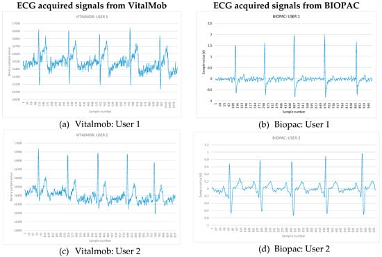 Figure 7 shows some of the performed tests for 2 users, in which two simultaneous signals were acquired simultaneously from the VM1 and from a BIOPAC system [26], so they could be compared side by side as shown. BIOPAC was used since it provides a better way of recording the data for computer-based analysis and comparison against the VM1 results than the regular medical ECG devices at the hospital. The most evident result is the perfect synchronization among R peaks, which verifies that the VM1 can be used for the analysis of rhythm and detection of its anomalies, such as arrhythmias, extrasystoles and tachycardia. Similarly, the width of the QRS pulse can be estimated with the VM1 and follows a high correlation and accuracy with the BIOPAC-obtained signal.