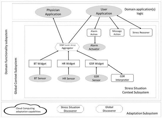 The global context subsystem was structured into two situation context subsystems. One of them is the stress situation context subsystem that was designed following the proposal, as shown in Figure 2. Its design was carried out applying the composition rules, which are based on the abstractions’ responsibilities as well as their possible interrelations following the context life cycle, as depicted in Section 3.1. As can be seen, those data needed to process a stress situation, BT, HR, and GSR are specified.