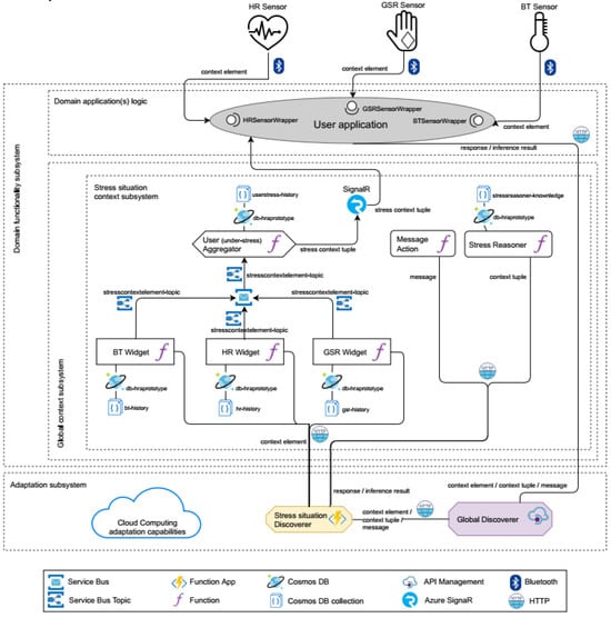 All the abstractions that make up the stress situation context subsystem, except for the discoverers, were implemented as serverless microservices using Azure Functions, as shown in Figure 3. As indicated, these functions facilitate the exploitation of the microservice architecture style. Concretely, every function was well-defined and cohesive around the matching abstraction concerns. Every function was also linked to a Cosmos DB [] (an Azure Not only SQL -NoSQL- database) scheme based on the needed data. Concretely, the resulting data models associated to the specified widgets and aggregator satisfied the statements made in the previous Section (i.e., the BT Widget stores BT values plus the sensing time, the sensor id, and the sensor precision; and the User (under stress) Aggregator stores tuples of BT, HR, and GSR values plus the gathering time and the associated user id). Each data scheme was managed and could be only accessed by the corresponding function. Every function was also serverless since Azure Functions act as containers offering automatic resource provisioning, as well as other adaptive capabilities supported by the cloud platform previously indicated.