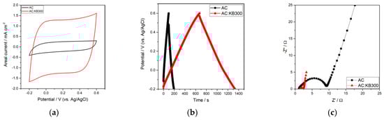 Figure 1a shows cyclic voltammograms at 5 mV s−1; the typical rectangular signal is observed in both printed electrodes and no redox peaks were detected, suggesting that no redox-active species were present in the printed electrodes. It should be noted that the CVs of printed electrodes of AC:KB300 exhibit a larger area compared with that of AC, demonstrating higher storing capabilities.