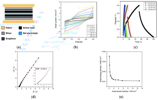The galvanostatic cycling of the device is reported in Figure 2c. The device was cycled between 0.4 and 1.6 mA cm−2, demonstrating an areal capacitance of 57.0 and 16.5 mF cm−2, respectively. Moreover, the internal resistance of the device was 16.5 Ω.