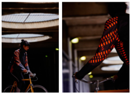 - Hardy, D.; Townsend, K.; Kgatuke, M.; Salter, E.; Downes, T.; Harrigan, K.; Allcock, S.; Dias, T. Light my elbows: A cycling jacket incorporating electronic yarn. In Proceedings of the Textile Intersections, Loughborough University, Loughborough, UK, 12–14 September 2019. [Google Scholar]