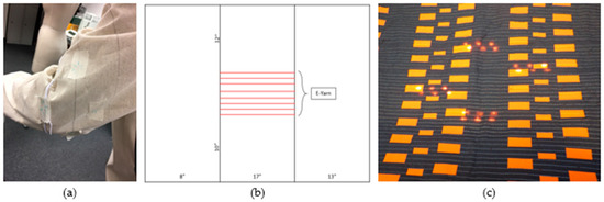 Some of the process used to integrate the LED-yarn into the cycling jacket sleeve. (a) Initial design idea for integrating E-yarn. (b) Garment pattern translated into digital file so that E-yarns were correctly placed in the sleeve. (c) Final woven fabric before being cut and sewn to create the sleeve.