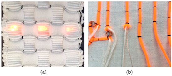 The LED E-yarns produced in this work were created using a semi-automated production method, similar to the process detailed in the literature [3]. The E-yarns were produced by soldering white LEDs (LNJ047X8ARA; Panasonic, Kadoma, Japan) onto thin copper wires and then encapsulating the LED, solder joints, and supporting yarns within a resin micro-pod. The micro-pod, supporting yarns, and wires were then covered in a braid using a Herzog braiding machine (RU1/24-80, Herzog GmbH, Oldenburg, Germany) and fluorescent orange (PGCD050) textured multifilament polyester yarn (1/167 dtex; Ashworth and Sons, Cheshire, UK). The overall diameter of the final LED-yarns was 2 mm.