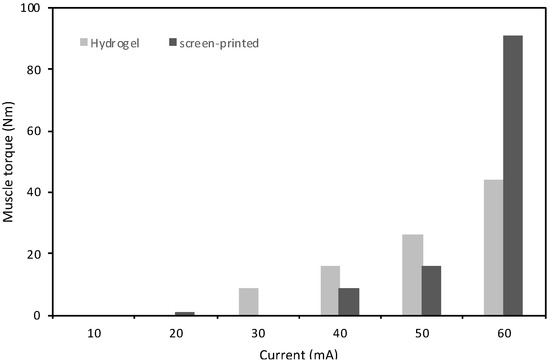 The experiment started with an initial current administered at 10 mA; however, a torque reading was not recorded for either the hydrogel or screen-printed electrodes. The results for torque trace during stimulation for both screen-printed and hydrogel electrodes are shown in Figure 2. For the hydrogel electrodes, the torque trace was activated at 30 mA (9 Nm) and increased with increasing current intervals up to 44 Nm at 60 mA. At 60 mA, the observed movement of the participant was significant but not described as uncomfortable by the participant.