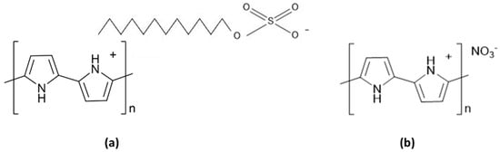 Schematic of polypyrrole (PPy) in the oxidised form with different counterions (a) dodecylsulfate; (b) nitrate.