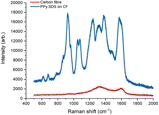 Raman spectrum of uncoated carbon fibre (red line) and PPy.SDS coated carbon fibre (blue line).
