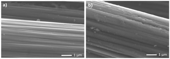 Scanning electron microscope images of (a) uncoated carbon fibre; (b) PPy.SDS coated carbon fibre.