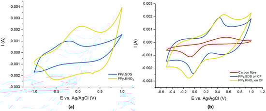 Cyclic voltammetry post-polymerization (Figure 4a) show oxidation peak potentials at −0.75 and 0.10 V (vs. Ag/AgCl) for the PPy.SDS and PPy.KNO3 films on CF, respectively. The surface area of the sensing fibre was calculated using the Randles–Sevcik equation; cyclic voltammetry was performed in 10 mM K3Fe(CN)6 and 0.1 M KCl as supporting electrolyte at different scan rates. Table 1 shows how the PPy.SDS film on CF gave a five-fold increase in electrochemical surface area, whereas coating with PPy.KNO3 resulted in a four-fold increase. Figure 4b displays the CVs of uncoated and PPy coated CF in potassium ferricyanide solution.