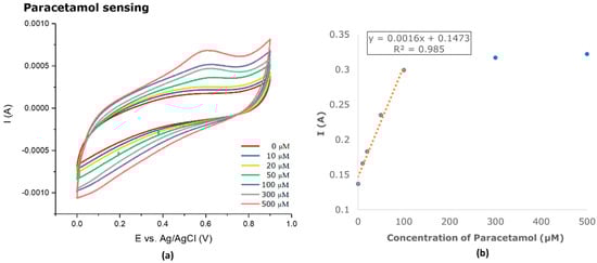 (a) PPy.SDS on CF sensing various concentration of paracetamol in 0.1 M PBS solution at a scan rate of 50 mVs−1; (b) calibration curve for PPy.SDS on CF with a concentration range of 0–500 µM paracetamol in 0.1 M PBS solution.