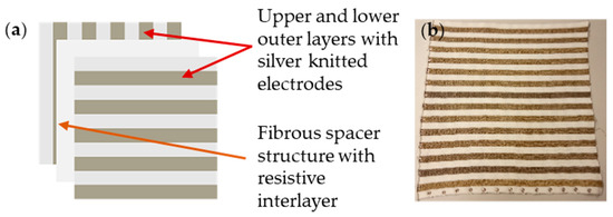 The resistive knitted pressure sensor. (a) An expanded illustration showing the three layers of the sensor: two outer fabric layers with knitted electrodes, and an inner spacer structure. (b) A photograph of the larger resistive knitted pressure sensor.