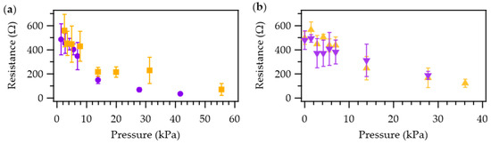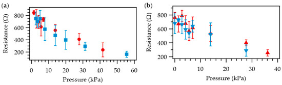 The pressure sensitivity of the sensors was examined for a single junction by exploring different applied forces over the junction, and different areas of applied force; this was important as the complex deformation of the textile spacer structure may result in different responses to pressure depending on whether pressure was changed with force or applied area [7]. Pressure changes were induced using round acrylic disks (diameter 15–70 mm) and metal weights (0.1–3.0 kg). Fixed force experiments investigated pressures of 2.5–55.5 kPa, and the fix area experiments covered pressures of 1.4–41.6 kPa. For hysteresis experiments a fixed area (30.0 mm diameter round disk) was used with the applied weight increased, and then decreased, covering a pressure range of 0–36.1 kPa. All resistance measurements were taken using a digital multi-meter (Model 34410A; Agilent Technologies UK Limited, Stockport, UK) unless otherwise stated. All reported values are the average of four repeat measurements using a single sample. All graphs were prepared using either IGOR Pro (Version 7.0.2.2; Wavemetrics, Lake Oswego, OR, USA) or Matplotlib [7].