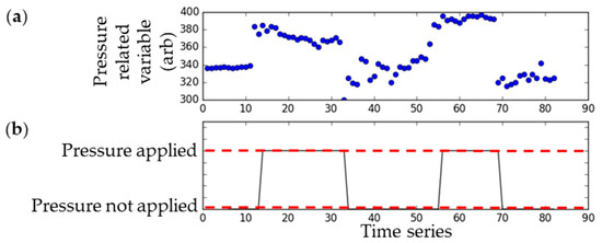 Results from a single junction where the investigator sat on the sensor, stood, sat again, and stood. (a) Raw data. (b) A determination of whether pressure was or was not applied.