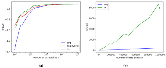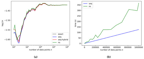 In all the experiments our sequential sampler seems to converge to the same result as NS within a negligible error for large n. The initial disagreement between NS and our sequential sampler on the first few thousand data points, seen in Figure 2a and Figure 3a, seems as if it can be attributed to the initial terms in Equation (3), since the proposed hybrid approach, replacing early terms in the sequential sampler by estimates based on NS, matches NS closely for all data set sizes.
