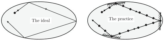 All locations within the constrained domain are equally acceptable, so the program might better try to proceed in a straight line, changing velocity only when necessary in an attempt to reflect specularly off the boundary (Figure 4, left). The user is asked to ensure that the imposed geometry makes sense in the context of the particular application, otherwise there will be no advantage.