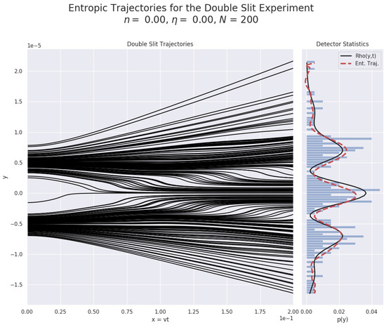 Entorpic trajectories for the double slit experiment with and for particles. The black curve () is the probability distribution determined from the wave function at the detector screen, while the red curve (Ent. Traj.) is the interpolated distribution from the detector statistics using a fitting polynomial of order 15 to show the shape of the distribution.