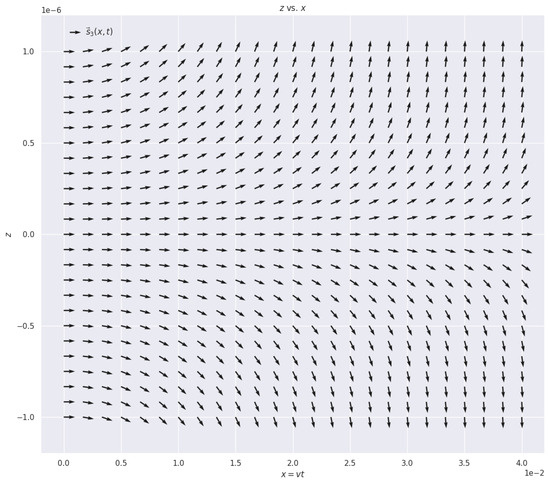 Starting with the initial condition , we show the evolution of the direction of the spin frame over x and t with respect to the -plane.