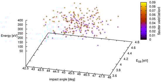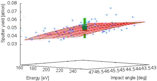 Extending the formulas of Section 2 to three random variables with , and , the summation of the terms in Equation (6) runs over three indices , and with an upper boundary of in the present setup of fourth order polynomials (for numerical accuracy of the Gaussian quadrature it is expedient to be one order higher than the polynomial order of the spectral expansion). This results in a total of 216 terms (three nested summations, each running from = 0 to 5 with i = 1, 2, 3) over the collocation points composed of 6 Gaussian quadrature abscissas assigned to and 6 weights . The value for the function is obtained from a SDTrimSP run, which takes roughly 3 min on a modern CPU. However, the complete run for the 216 terms can be speeded up enormously since the calculations are independent and can be done in parallel. Once calculated, the 35 coefficients of Equation (6) establish a fast surrogate model, which is simply the evaluation of a polynomial. This is shown in Figure 2 as the red mesh. The respective sputter yield, for which the uncertainty quantification was performed, is depicted in the center as the green sphere with at/ion and its standard deviation of as the green perpendicular line. The comparison with the result of the sampling approach above () shows excellent agreement.