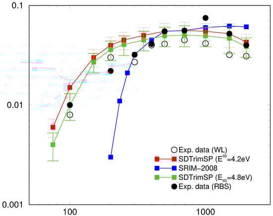 Comparison of the sputter yield for the previously set surface binding energy eV (red squares) and the newly acquired setting of energy eV (green squares) with data from experiments done in a Rutherford backscattering setup (RBS, filled circles) and a weight loss setup (WL, open circles). A further model, SRIM (blue squares), can almost certainly be ruled out. All lines shown are guide to the eye.