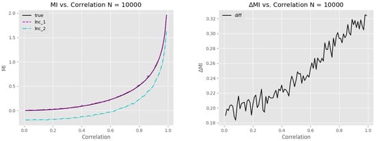 Comparison of mutual information estimates LNC for a bivariate normal distribution before (lnc_1) and after (lnc_2) a linear transformation of one variable by a factor of . The second plot shows the difference between (lnc_1) and (lnc_2).