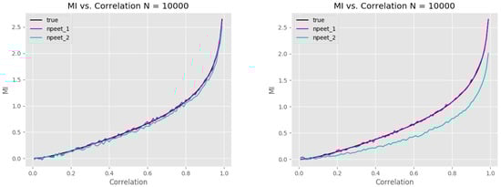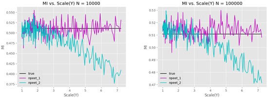 Comparison of mutual information estimates KSG for a multivariate normal distribution with equal correlation coefficients before (npeet_1) and after (npeet_2) a linear transformation of one variable by a factor of 10. The second plot compares the KSG estimators after four variables are multiplied by a factor of 10.