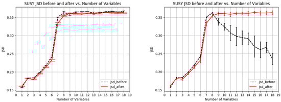 Comparison of MI values for increasing additions of discriminating variables for the SUSY data set. The first eight variables are low-level and the last ten are functions of the first eight. The first plot shows a comparison of (NN) performance when the last ten variables are redundant while the second shows how KSG’s accuracy deteriorates when the high-level variables are shuffled.