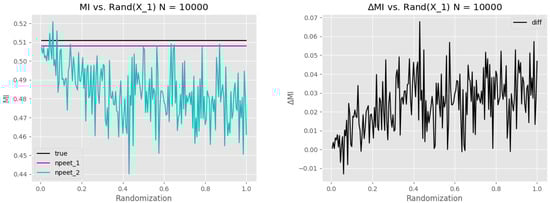 Comparison of mutual information estimates KSG for a bivariate normal distribution before (npeet_1) and after (npeet_2) a linear transformation of one variable by a factor of . The second plot shows the difference between (npeet_1) and (npeet_2).