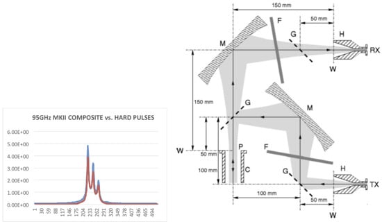 Figure 1 shows the results of a scaled emulation of an effective composite-phase sequence described by Crepeau, et al. []. The sequence reported on here consists of the sequence 9 ns/, 5 ns/, 4 ns/, 3 ns/, for a total composite pulse length of 21 ns. Reproduction of this composite pulse is of reasonably high fidelity, with the exception of some observed interference due to multiple reflections that contaminate the final (3 ns) slice. With the enhancing Fabry-Pérot resonator assembly coupled to reference plane ’W’ shown in the right panel of Figure 1, it was determined that the CPS pulse at an output power level approximately 50% of produced spectral coverage (red trace) and an effective value virtually indistinguishable from a 5 ns EIK hard pulse (blue trace). This result clearly demonstrates that a CPS pulse can successfully emulate a hard pulse of significantly shorter duration and higher peak power. Work is currently under way to extend this preliminary result to CPS pulses and thus spin echo pulse sequences. Further applications to pulse spectroscopy at higher frequencies, e.g., 240 GHz are also under way. In order to determine suitable CPS pulse characteristics at 240 GHz, we are revisiting the parameter optimization problem discussed in Section 3. This is especially timely as significant advances in computational hardware since the original studies of Crepeau, et al. [] have allowed more computationally intensive search algorithms to be usefully employed. Work is under way to extend the Laplace transform techniques reported on in this work to the CPS pulse optimization problem. For this purpose, we are developing a nested sampling approach to determine the CPS parameters that optimize the relevant cost functions for and pulses. Extensions of the methods covered here to longer pulse sequences involving three optimally phased pulses for exploring multidimensional pulse ESR spectroscopy are also under way.