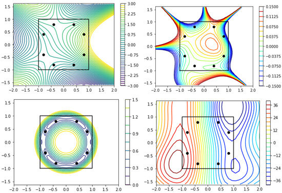 For treatment of PDEs possible choices of index variables in (4) or (6) include separation constants of analytical solutions, or the frequency variable of an integral transform. In accordance with [10], using basis functions that satisfy the underlying PDE, a probabilistic meshless method (PMM) is constructed. In particular, if parameterizes positions of sources, and in (6) is chosen to be a fundamental solution/Green’s function of the PDE, one may call the resulting scheme a probabilistic method of fundamental solutions (pMFS). In [10] sources are placed across the whole computational domain, and the resulting kernel is called natural. Here we will instead place sources in the exterior to fulfill the homogeneous interior problem, as in the classical MFS [6,7,8]. Technically, this is also achieved by setting for either or in the interior. For discrete sources localized one obtains again discrete basis functions for (4).