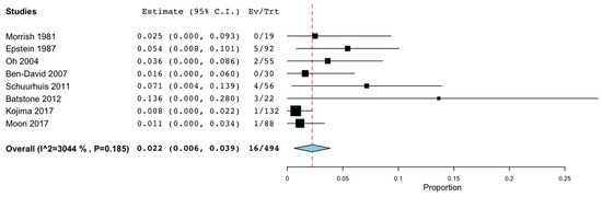 Among 2020 records screened, only 8 were included in this review (Figure 1). Sixteen of 494 patients who underwent tooth extraction before radiotherapy developed ORN at extraction site, with an ORN incidence of 2.2% (95% Confidence of Interval = 0.8—3.9, p < 0.204, I2 = 2695%) (Figure 2). All cases of ORN due to pre-RT dental extraction were reported in mandible.