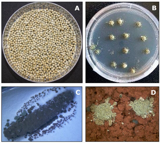 Metarhizium anisopliae formulated in calcium alginate granules (CAGMa+Cs+By) for soil insect control (A); the fungal granule CAGMa+Cs+By containing corn starch and autoclaved baker’s yeast as the food source for M. anisopliae produced the optimal resporulation (B); a conidiated cadaver (mealworm) caused by the infection of resporulated CAGMa+Cs+By (C); and CAGMa+Cs+By resporulated in pasteurised soil following one month of incubation (D). (Photos source: Sudhan Shah).