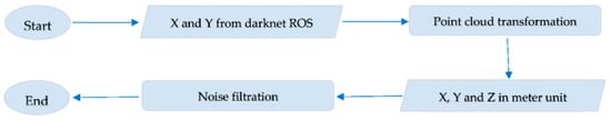3D positioning systems for indoor environment using Intel RealSense Depth camera D435i is utilized as a positioning sensor which set origin coordinates X = 0 at middle of camera’s frame, Y = 0 at ground level and Z = 0 at position of depth camera and detect Bebop2 with YOLOv3 object detection. The bounding box pixels of target object on screen size 640 × 480 pixels send to points cloud topics of Intel RealSense Depth camera D435i that collect the coordinate x, y and z in every single pixel. For receives the coordinate x, y and z in meter unit, coordinates pixel center x and y from darknet ros [3] send to points cloud topic with point cloud library (PCL) for transformation of pixel to meter. Moreover, there is some noise from the position x, y and z in meter after transformation that could filter. This research, using average method with 50 window size of data as a Noise filtration method. In additional the schematic diagram of working flow shown in Figure 2.