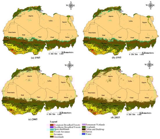 The availability of LULC generated over a period of 33 years has been an important dataset to characterize the LULC dynamics of large areas. The detection of change over the last three decades shows that the class of urban and built-up, barren or sparsely vegetated, savannas and deciduous broadleaf forests has declined considerably. Open shrublands, woody savannas and water decrease considerably over the three decades. Croplands decrease in the first decade and increased over the last two decades. Grasslands recorded a first decade increase, and then decreased from 1995 to 2015. Permanent wetlands first decade decrease, and then increase a second decade, followed by a decreasing trend during the last decade. Evergreen broadleaf forests decreased in the first two decades and increased over the last decade. The 33 years of annual land cover maps with the detection of changes over the last three decades, will form an important dataset to identify recent LULCC associations with climate changes over North and West Africa. If we don’t have a continuous LULC map in other geographic areas, we can use the pre-processing, the classification and the validation methods applied in this study.