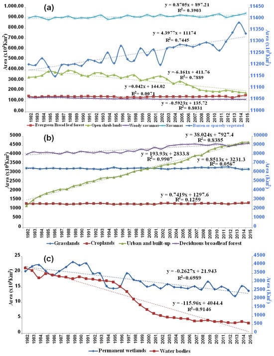 Temporal changes in area of LULC from 1982 to 2015.