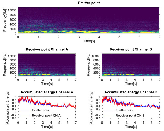 In this section, we evaluate the changes suffered in the frequency domain when recorded ANEs were propagated through two different multipath channels (Channel A and Channel B, explained in Section 3). We show in Figure 1, Figure 2 and Figure 3 the outcomes related to different ANEs, i.e., the noise of an airplane, a bell, and a horn. For the sake of brevity, we only show these three examples, which are representative of the phenomena we want to outline. For each of them, we show the spectrogram of the emitted signal in the upper plot, the spectrogram of the received signal through Channel A in the mid-left plot, and the spectrogram of the received signal through Channel B in the mid-right plot. Finally, in the lower plots of each figure, we show the accumulated energy at the receiver when propagating through Channels A and B, on the left- and right-hand side, respectively. The spectrogram chops the signal into 40-ms segments, which were windowed with a Hanning window to reduce leakage and transformed into the frequency domain by means of a 2048-point FFT, displayed in a natural scale. Consecutive segments were overlapped by a factor of to maximize the probability of detection.