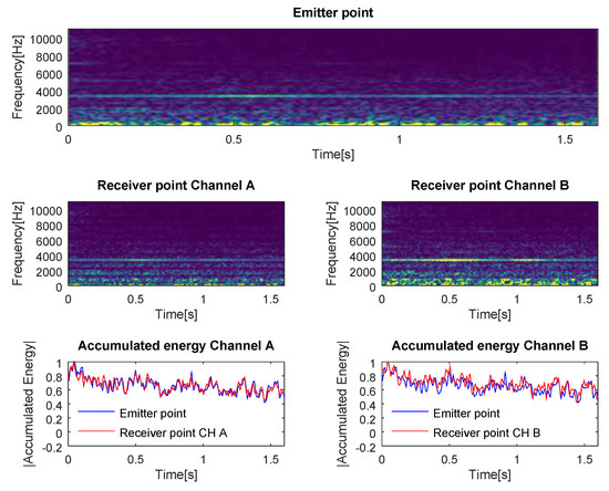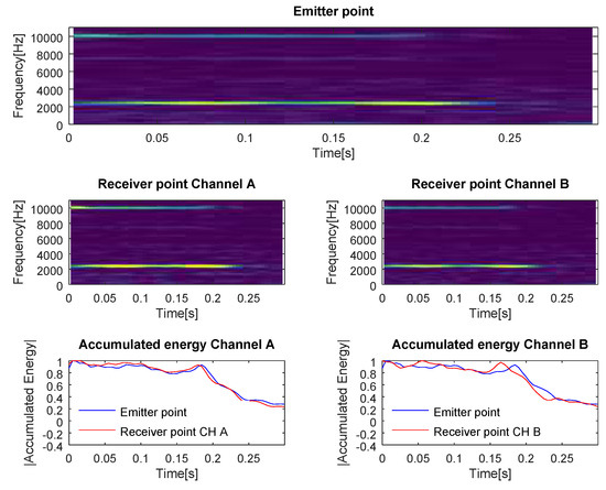 In Figure 2, we can observe two phenomena. The first one is that the frequency distribution of the energy changed depending on the type of channel, and the second one is that the intensity of the received sound may depend on the number of paths of the channel and the phase of each of them when impacting the receiver. In Figure 3, we can observe that Channel A and Channel B influenced the intensity of the high frequency components (e.g., the component at 10 kHz), as well as their time length. In Figure 1, we can observe that the intensity and number of high frequency components were both reduced in Channel B compared to Channel A.