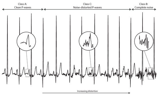 P-waves were classified into three different classes: high-quality clean P-waves (class A), unreliable, noise-distorted P-waves (class C), and complete noise or absent P-waves (class B). Even though class C P-waves had some resemblance to normal P-wave morphology, they were still considered unreliable. For that class, the degree of distortion varied from mildly to heavily distorted.