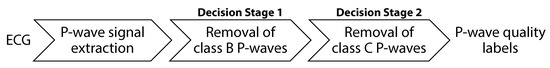 The P-wave quality index (PQI) tool consisted of three steps. In the first, the P-waves were identified in the electrocardiogram (ECG) and extracted. P-wave template morphologies and P-wave features were extracted from these P-waves and were used in two different decision-making stages. This resulted in each P-wave being labelled as either high (class A) or low quality (classes B and C), allowing artefact-corrupted and unreliable P-waves to be excluded from the analysis.