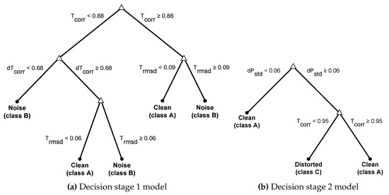 Decision trees used in the decision-making stages of the P-wave quality index (PQI) tool. These models used features obtained from the P-wave signal and P-wave template comparisons.