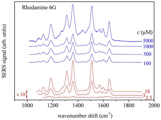 Surface Enhanced Raman Spectroscopy (SERS) of Rhodamine 6G aqueous solutions at different concentrations in the range of 2.5–5000 μM. The intensity of the spectra reported in red is amplified by a factor of 10. The spectra reported are arbitrarily shifted along the y-axis.