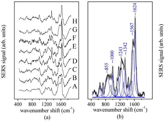 SERS signals from tears were collected in conditions similar to those used for the preliminary measurements on Rhodamine 6G. In this case, the acquisition time was typically of 180 s. The SERS spectra reported in Figure 2a are obtained by averaging the SERS responses measured in different places of the sample (at least three positions) of tear fluids collected from the eight healthy volunteers, here identified by letters from A to H (see Table 1). Amide I and Amide III Raman bands are clearly evinced in the spectra of Figure 2a at the spectral positions of ~1600 cm−1 and ~1250 cm−1, respectively. Relevant similarities occur in the reported spectra. The average spectrum obtained by the sum of the spectra of Figure 2a is reported in Figure 2b. By means of a fit numerical procedure, the signal was deconvoluted in terms of Lorentzian components and is reported in Figure 2b as blue curves. The spectrum is rich in components, as expected in an organic fluid. In Figure 2b are indicated some of the most prominent modes, at 855, 1000, 1243, 1342, 1567, and 1624 cm−1. On the basis of SERS investigations on proteins reported in literature [18,19], a tentative assignment of the observed modes indicates that they are mainly due to single amino acid residues [20]. The mode at 855 cm−1 is assigned to C-C stretching and is present in many substances such as Uracil and Cytosine [19]. Similarly, the modes at 1243 cm−1 and 1342 cm−1 related to CH2 and CH3 vibrations, respectively, are typically observed in amino acids as, for instance, Aspargine and Leucine [19]. The sharp peak at 1000 cm−1 is related to Phelnylanine or Thymine [19] and is generally present in the Raman spectra of organic substances. The prominent broad mode at 1567 cm−1 is assigned to NH2 and C2-N10 bonds and it is found, for instance, in Guanine spectrum [18]. Finally, the strong peak at 1624 cm−1 is related to the Amide I band of protein and vibration of C=O bonds. It can be the indication of the presence of Tryptophan or Aspargine, as well as of other amino acids [18]. The main protein components revealed by the biochemical analysis in the tear are: Lactoferrin, Lysozyme, Lipocalin, Immunoglibulin (IgA) and Albumine [10]. All these substances have complex structures where many different amino acids concur to the composition. However, pathological status can alter fluid composition equilibrium, changing the amino acid relative concentrations and the concerned SERS response. For instance, an increase of the branched-chain amino acids Isoleucine, Leucine and Valine levels, potentially detectable by SERS, can be the mark of neuronal diseases [21].