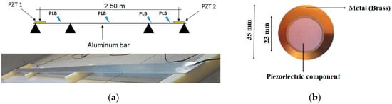 is the elastic compliance under a constant electric field, Ek and Di are the electric field and electrical displacement components, respectively, Due to the direct piezoelectric effect shown in Equations (1) and (2), this kind of transductor can be set as an acoustic emission (AE) sensor because waves generate mechanical stress and therefore electrical voltage. One application of this sensor is the location of failures in metallic structures. Material delamination, breakage, impacts, shear, friction, or any kind of physical-chemical damage would generate ultrasonic waves [,,,], and therefore could be located using such sensors. For example, damage in metallic materials generates acoustic waves between 20 and 500 kHz, which is easily detectable by this kind of sensor. The transducers used in this work were the piezoelectric diaphragms, which have similar characteristics to conventional lead zirconate titanate (PZT) ceramics [,]. The piezoelectric diaphragms consist of a circular brass plate, with dimensions of 35 × 0.2 mm, and a circular piezoelectric ceramic, with dimensions of 23 × 0.22 mm and an attenuation of 3 dB at 225 kHz [].