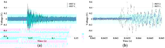 The low-cost transductors were sensitive to the acoustic waves generated by PLB as impulsive signals were acquired, as shown in Figure 3. However, there were uncertainties regarding the determination of arrival time of the signal in each sensor, according to Figure 3b, which indicate the necessity to apply either Hinkley or Akaike to correctly locate the damage.