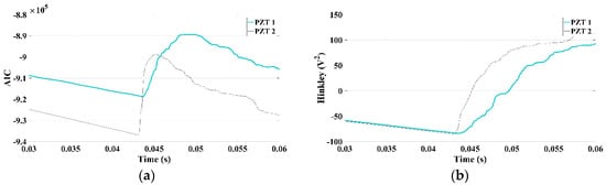 According to Figure 4, signal for x = 0.5, the excitation time using Hinkley and Akaike criteria were based on the minimum from each curve, 325 and 305 µs, respectively. The difference between these two criteria is due to the uncertainty in the beginning of the signal acquisition, which is calculated using autoregressive algorithms. Based on such excitation times, the location of the damage was calculated using Equations (7)–(9), and the data are presented in Table 1.