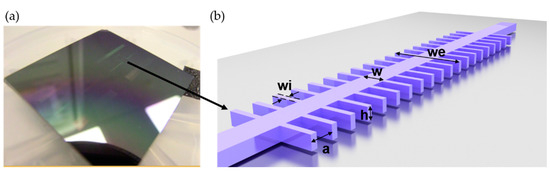 (a) Photonic chip, manufactured in a silicon on-insulator (SOI) wafer, containing the nanophotonic sensing structures. The black arrow indicates the position where one of the photonic sensing structures is located. (b) Schematic representation of the 1D photonic bandgap (PBG) sensing structure with descriptive key dimensions.