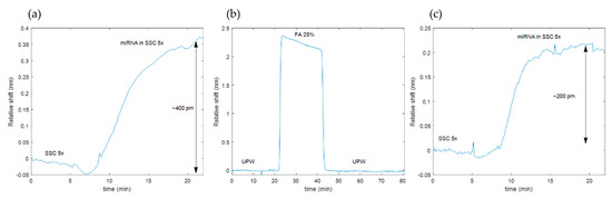 Time evolution of the PBG edge position of the sensing structure: (a) Acquired during the initial experiment for detection of miRNA; (b) acquired during the online regeneration with formamide (FA) in ultrapure water (UPW); (c) acquired during the second experiment for detection of miRNA (after regeneration).