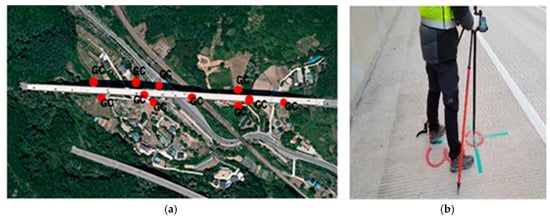 The bridge selected for the case study was Wonjudaegyo Bridge, located in Panbu-myeon, Wonju-si, Gangwondo Province. It was completed in 1995 and is a steel box girder bridge. Of a total 11 shifts, images were obtained during shifts 2–4. Figure 1 shows Wonjudaegyo Bridge and Ground Control (GC) points used for this study.