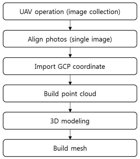 First, a set of control points were established to register the images, then GPS survey was performed to obtain their precise coordinates. After that, the UAV was flown to take pictures. For processing of the obtained UAV images, PIX4D Mapper software was used. For the coordinate system, the international system of WGS94 coordinates was used, and the variable values of the camera used for recording were considered for the processing. Figure 2 shows a flowchart for the general UAV image processing.